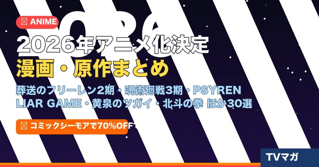 2026年は超話題作のアニメ化が目白押しです!「葬送のフリーレン2期」「呪術廻戦3期」「PSYREN」「黄泉のツガイ」「LIAR GAME」など、放送前から大注目の作品が続々と控えています。