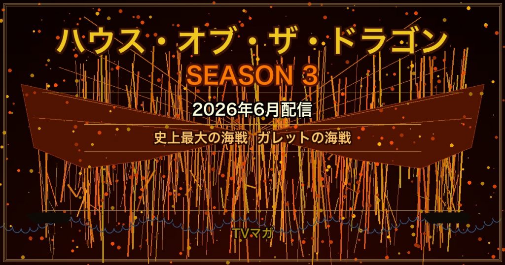 ハウスオブザドラゴン(House of the Dragon)シーズン3は、2026年6月にU-NEXTで独占配信開始予定です。全8話構成で、シリーズ最大の見どころ「ガレットの海戦(Battle of the Gullet)」がついに映像化されます。